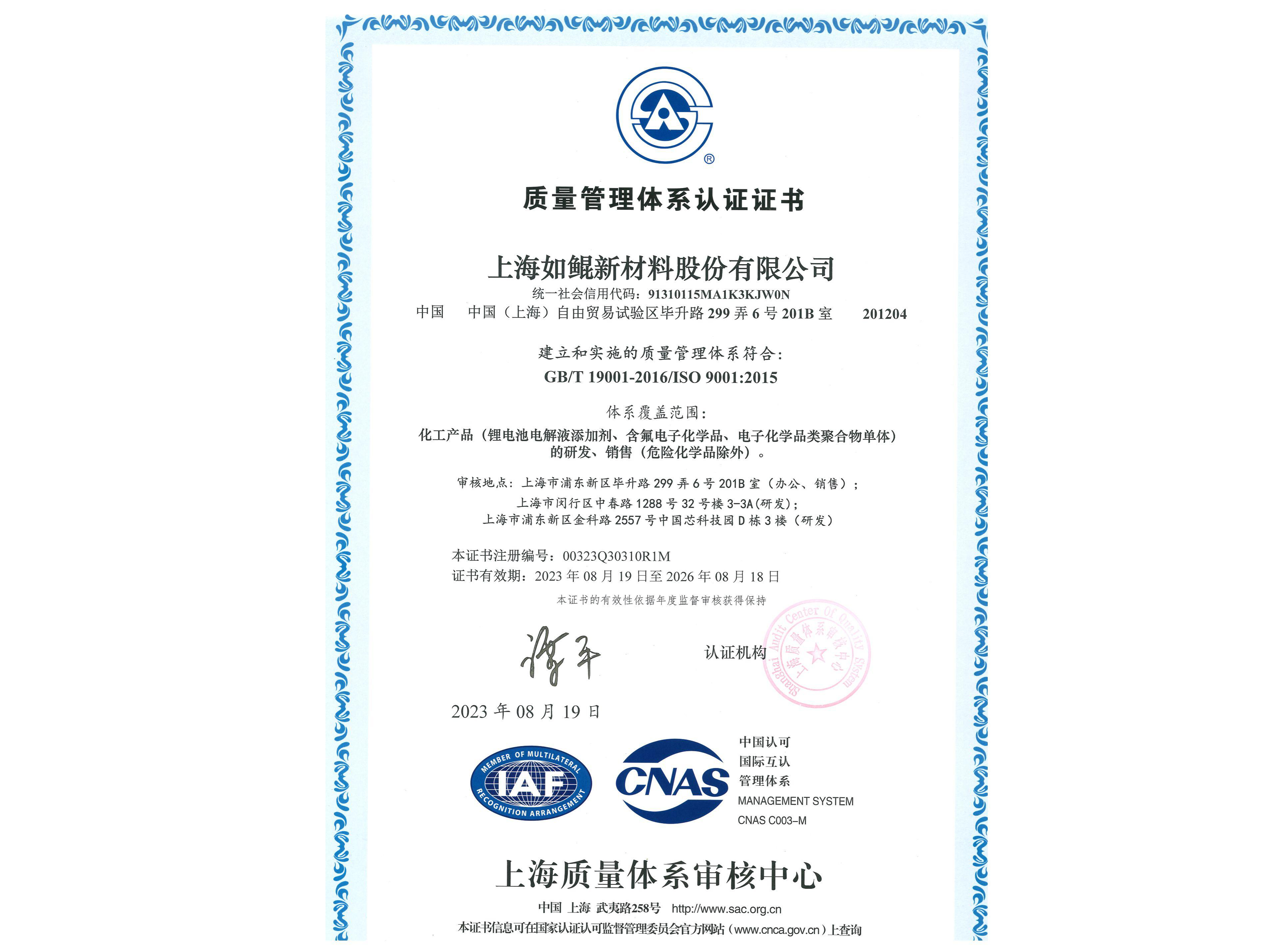 ISO9001質量管理體系認證證書